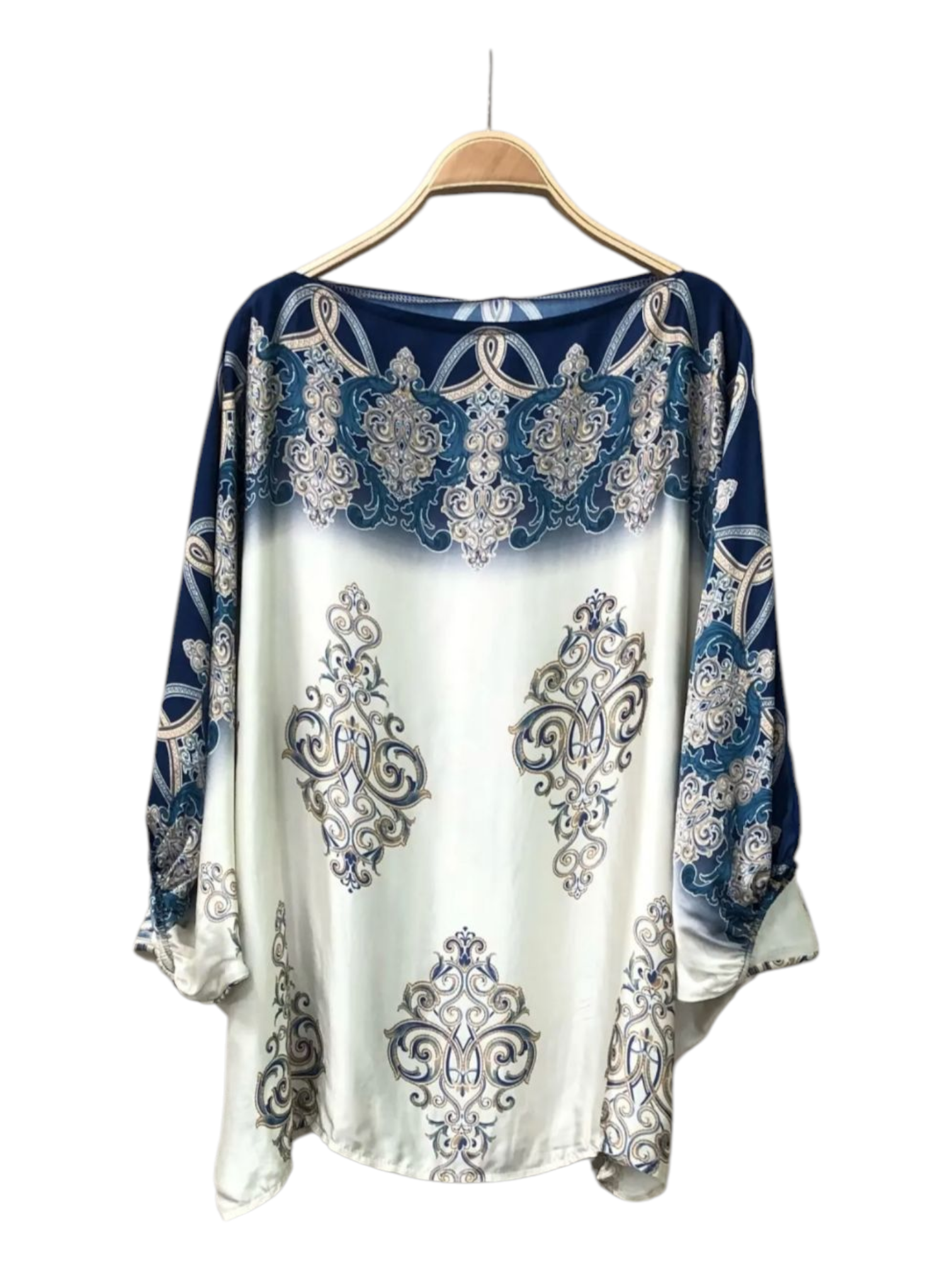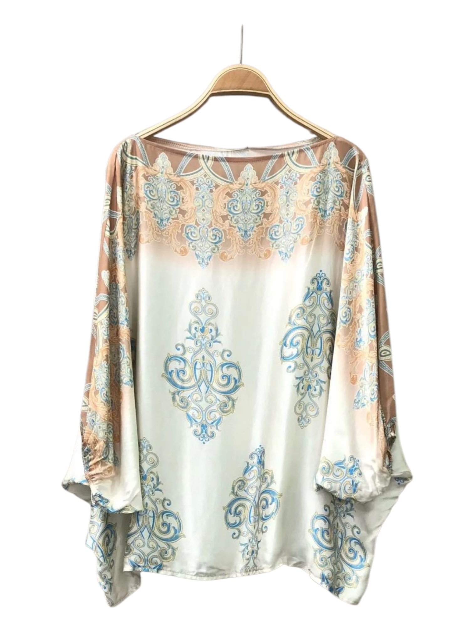 Blusa fluida de satén con corte tipo poncho estampada. Talla única, cómoda y favorecedora, ideal para lograr un look veraniego con estilo. Puedes llevarla sola o combinarla con el pantalón a juego para un conjunto impactante y elegante.