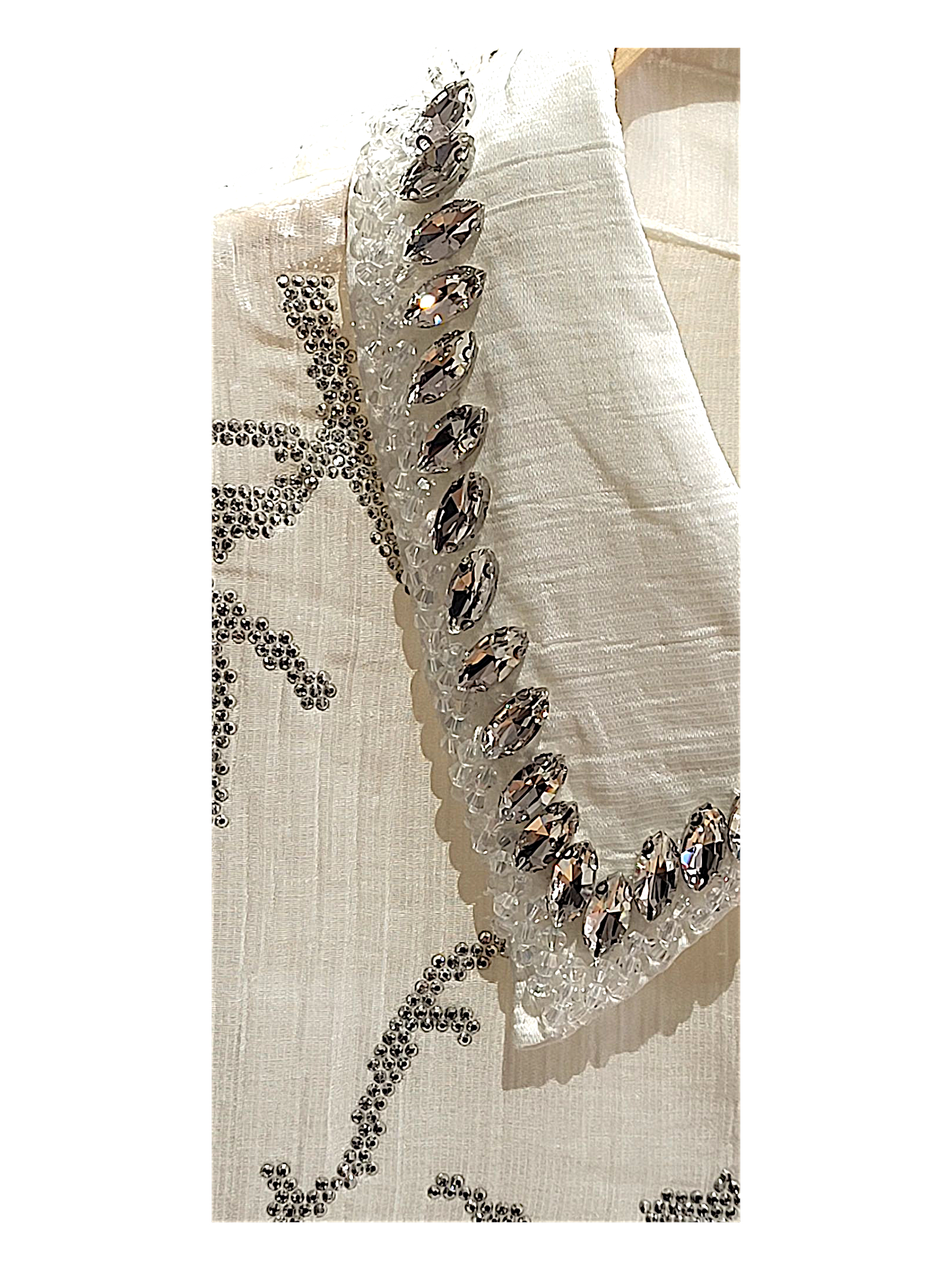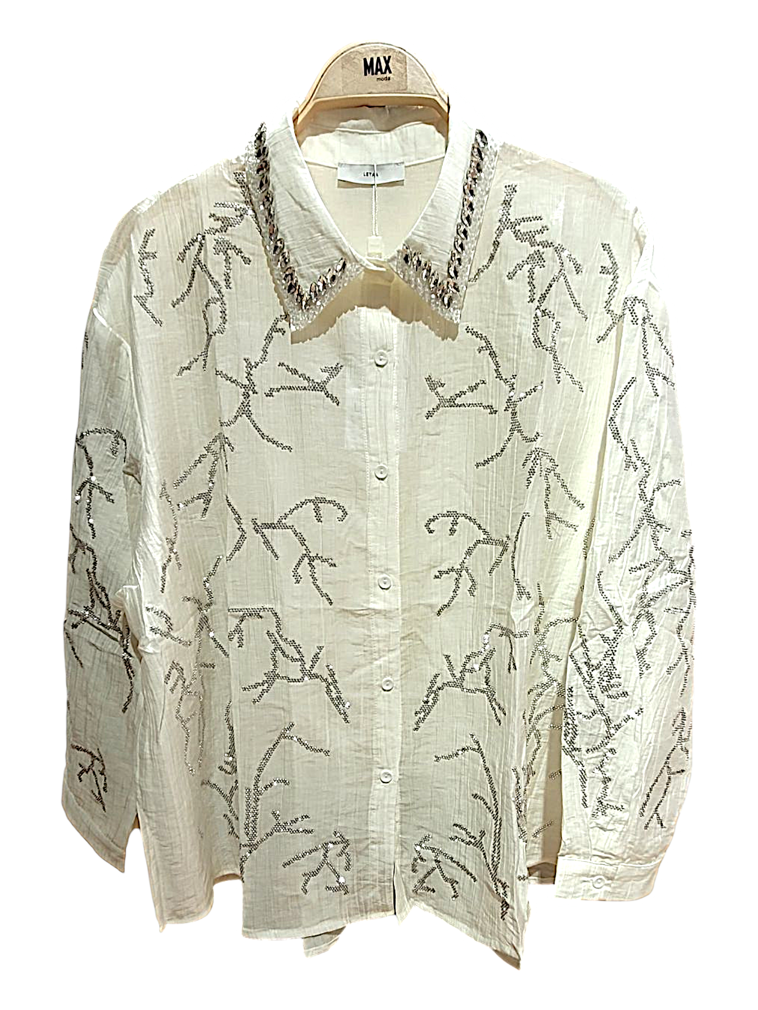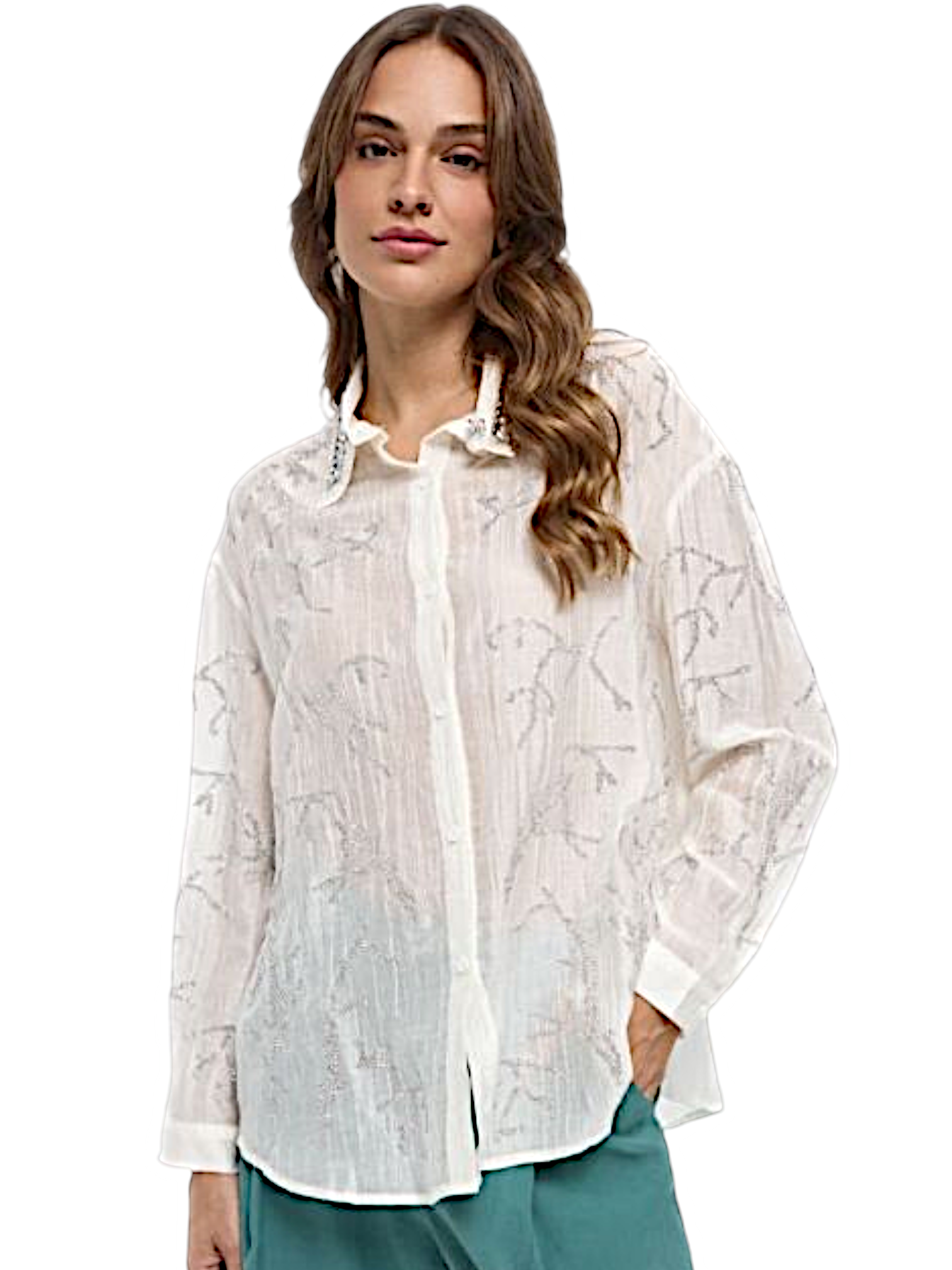 Una pieza única y sofisticada. Confeccionada en suave tencel, esta camisa deslumbra con cristales en toda su superficie, aportando un brillo sutil y elegante. Su cuello con detalles de pedrería realza su diseño exclusivo, convirtiéndola en la opción perfecta para ocasiones especiales o para elevar cualquier look con un toque de lujo.