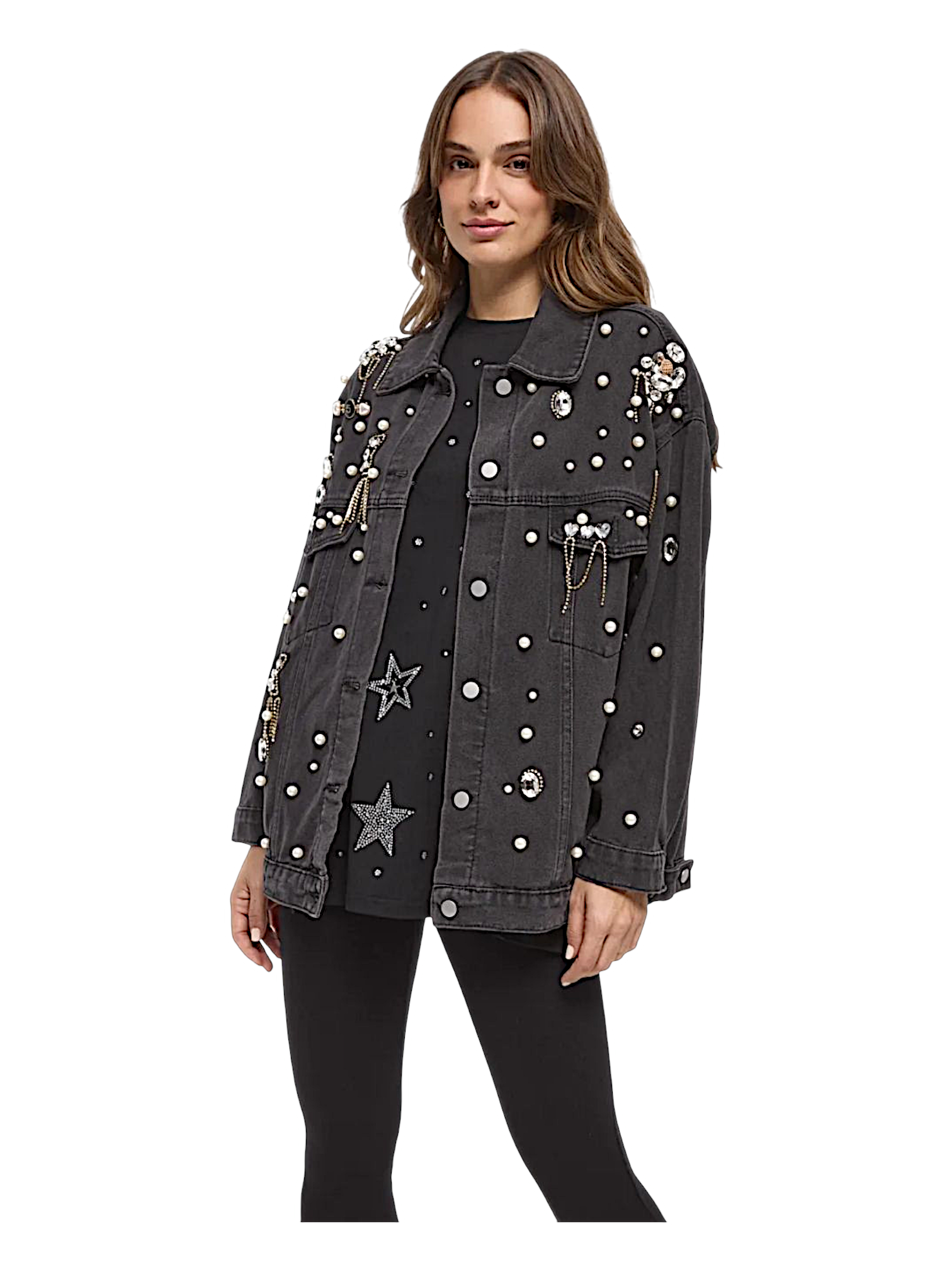 Atrévete a brillar con esta cazadora vaquera negra de corte oversize, adornada con apliques de perlas, pedrería y cadenas. Su diseño sofisticado y lleno de detalles