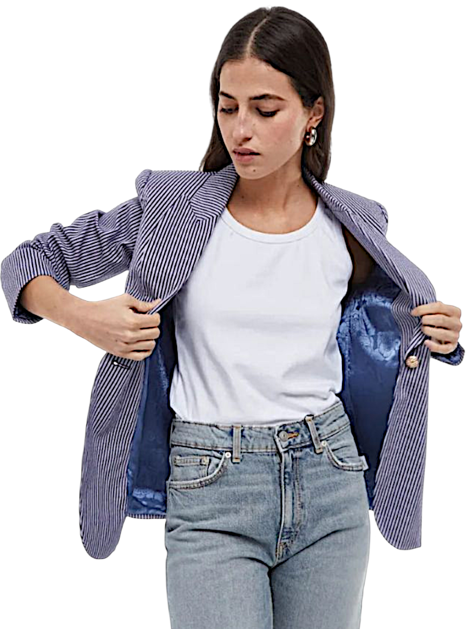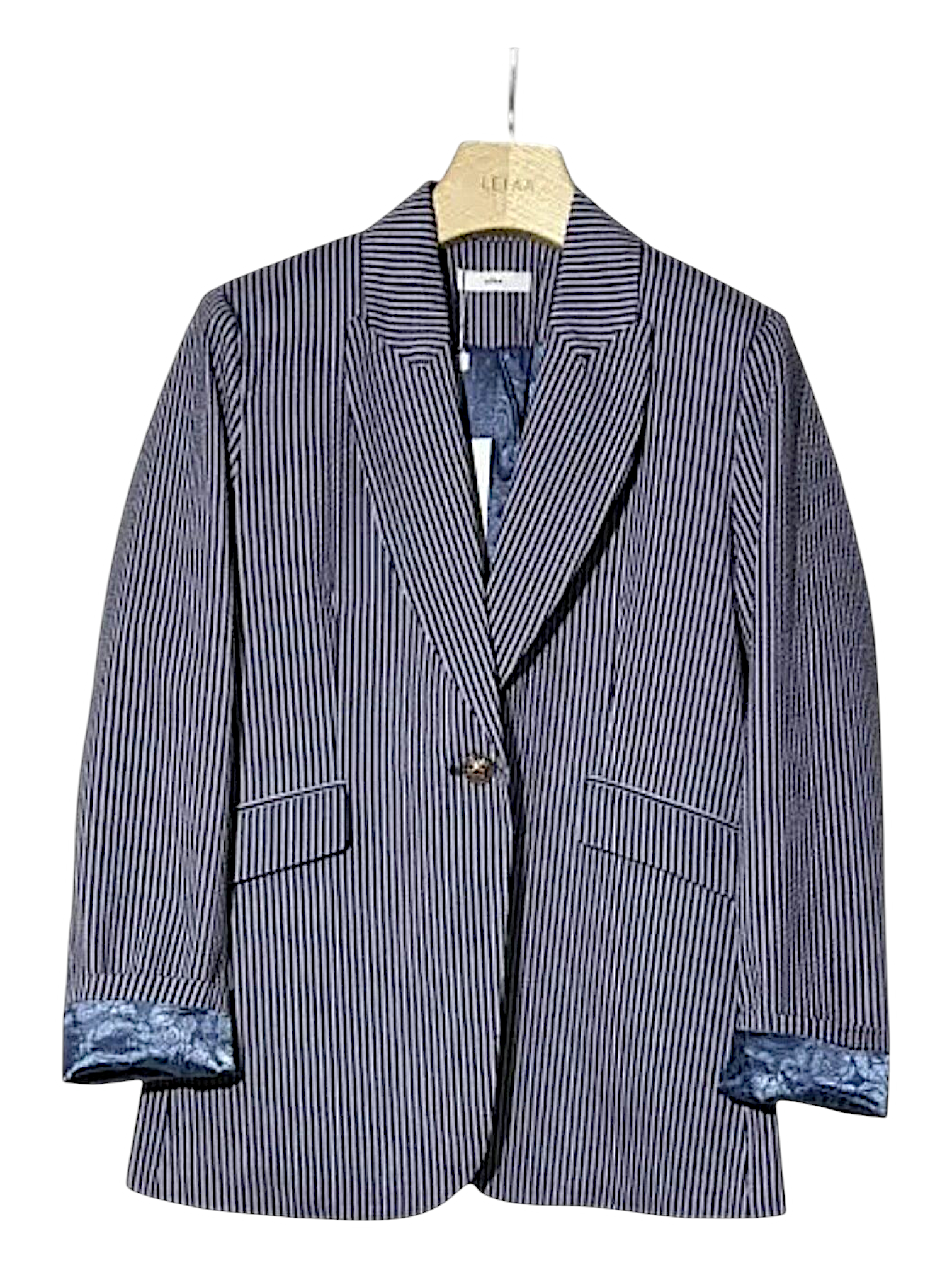 Blazer de corte recto con estampado de finas rayas verticales en tonos oscuros y claros, aportando un aire sofisticado y atemporal. Presenta solapas clásicas, cierre con un único botón y bolsillos con solapa decorativa en la parte frontal. Su forro interior en contraste y los puños vueltos con detalle satinado le añaden un toque especial. Ideal para llevar en conjunto con el pantalón a juego o combinar con otras piezas para un look elegante y versátil.