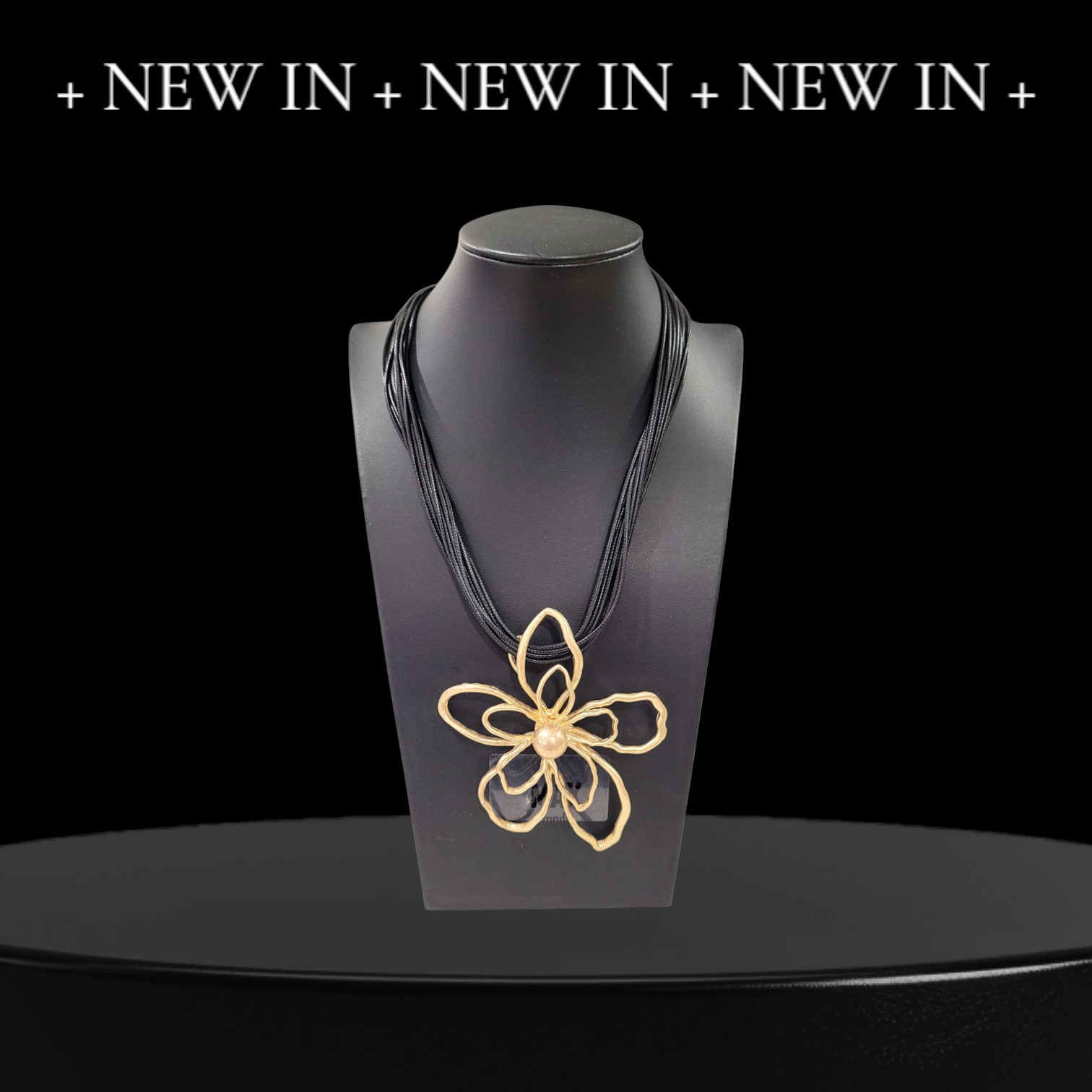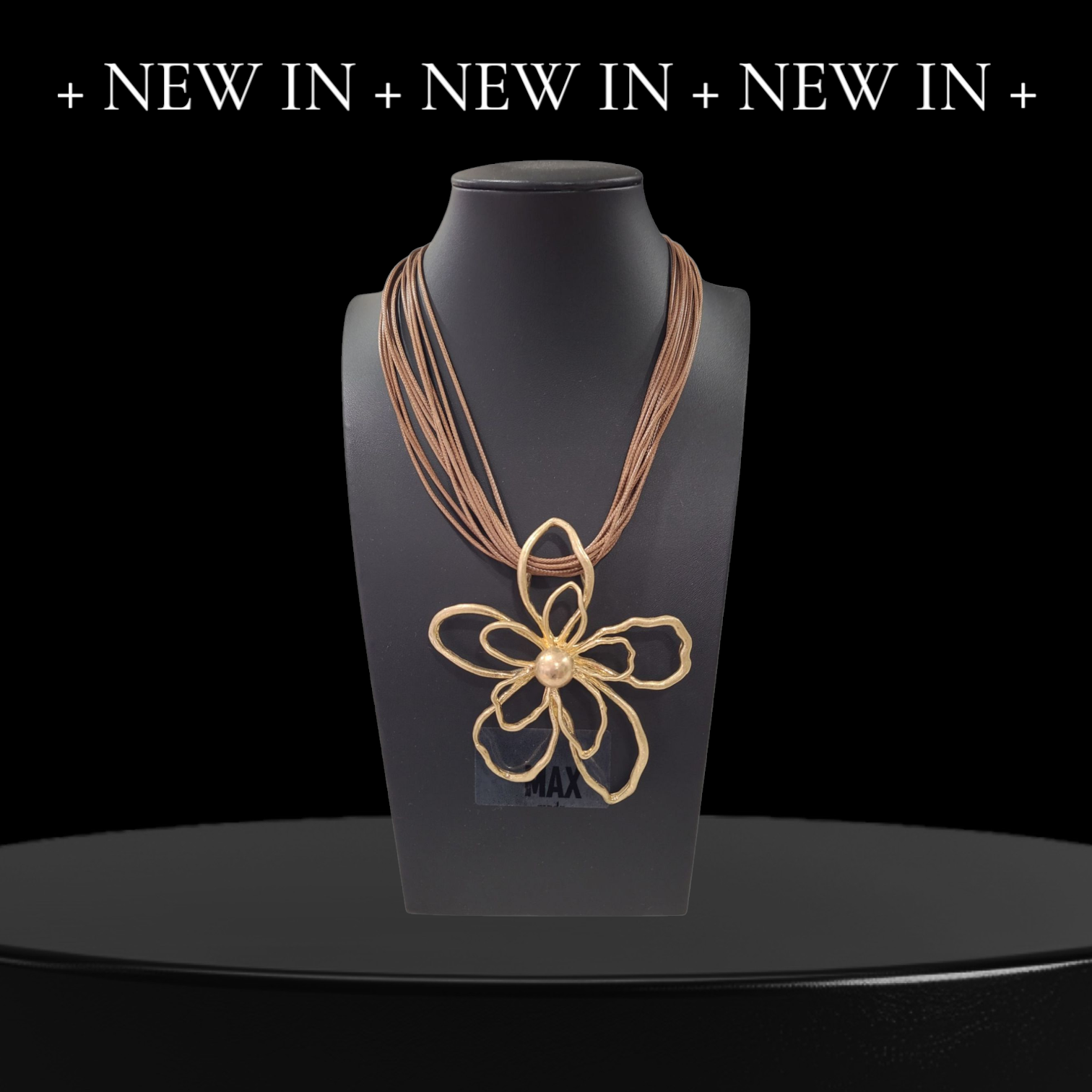 Colgante con flor dorada en relieve y cordones en negro o marrón. Diferente, llamativo y con ese toque especial que levanta cualquier look.