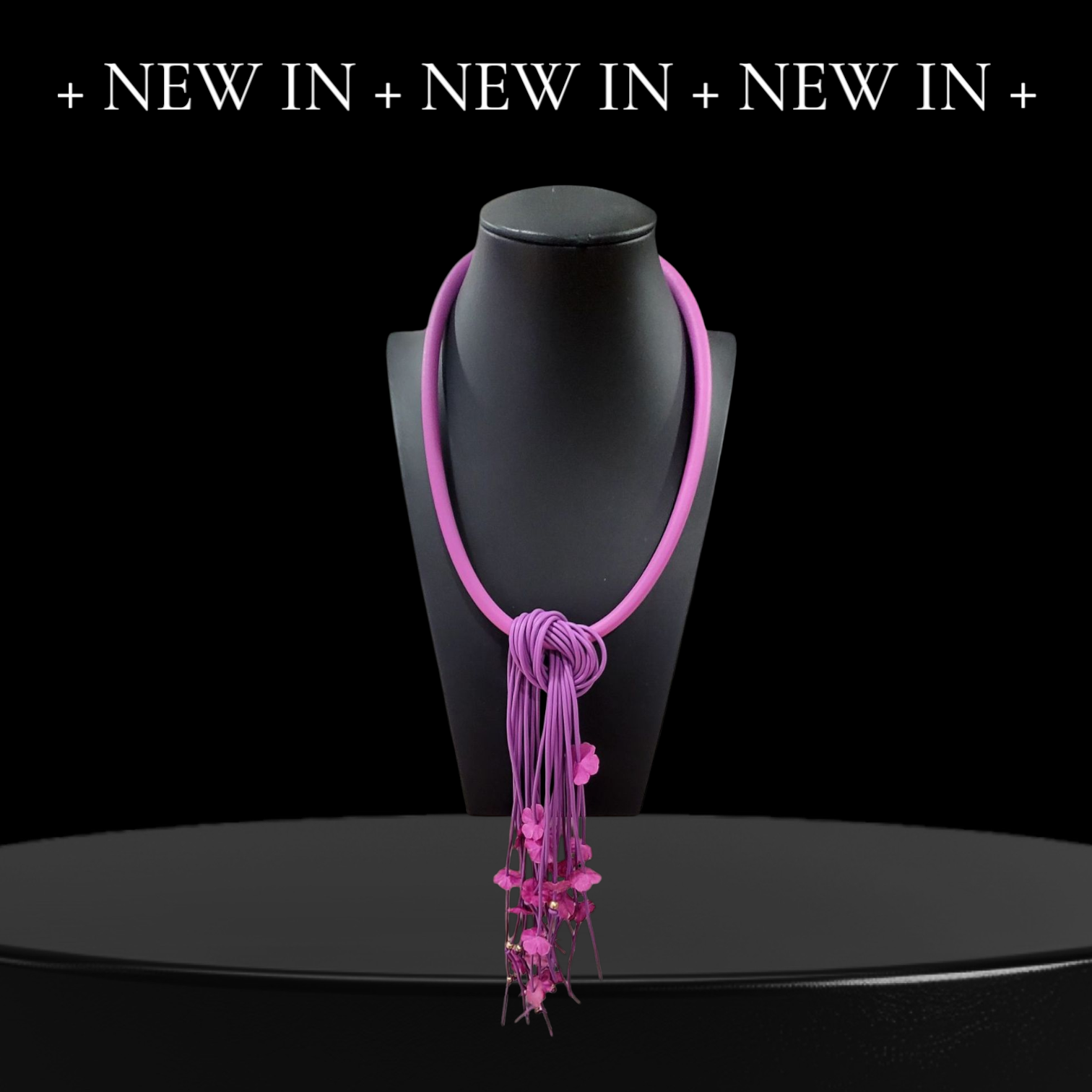 Un toque atrevido y diferente. Este collar largo de goma, con cierre imantado, es tan cómodo como impactante. El nudo central y las flores colgantes hacen de él un accesorio perfecto para destacar. Disponible en varios colores.