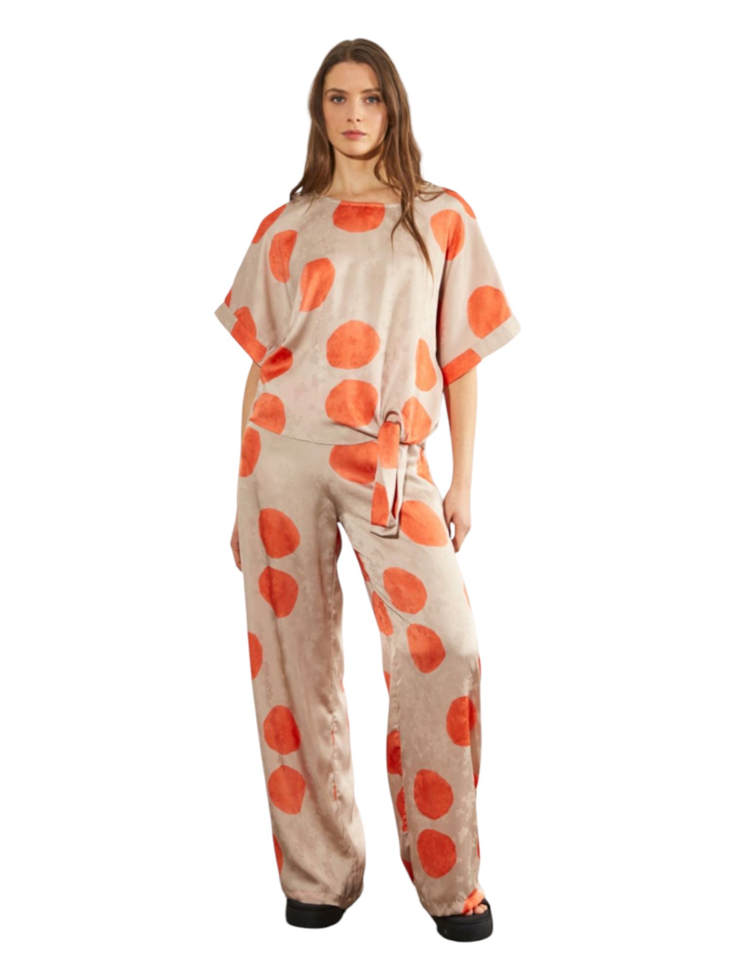 Disfruta del verano con este conjunto top y pantalón a la última con estampado de lunares. Confeccionado con tejido de alta calidad, este conjunto ofrece dos opciones de color para complementar tu estilo. Añade tendencia y comodidad a tu armario con este conjunto de blusa y pantalón perfecto para cualquier ocasión.