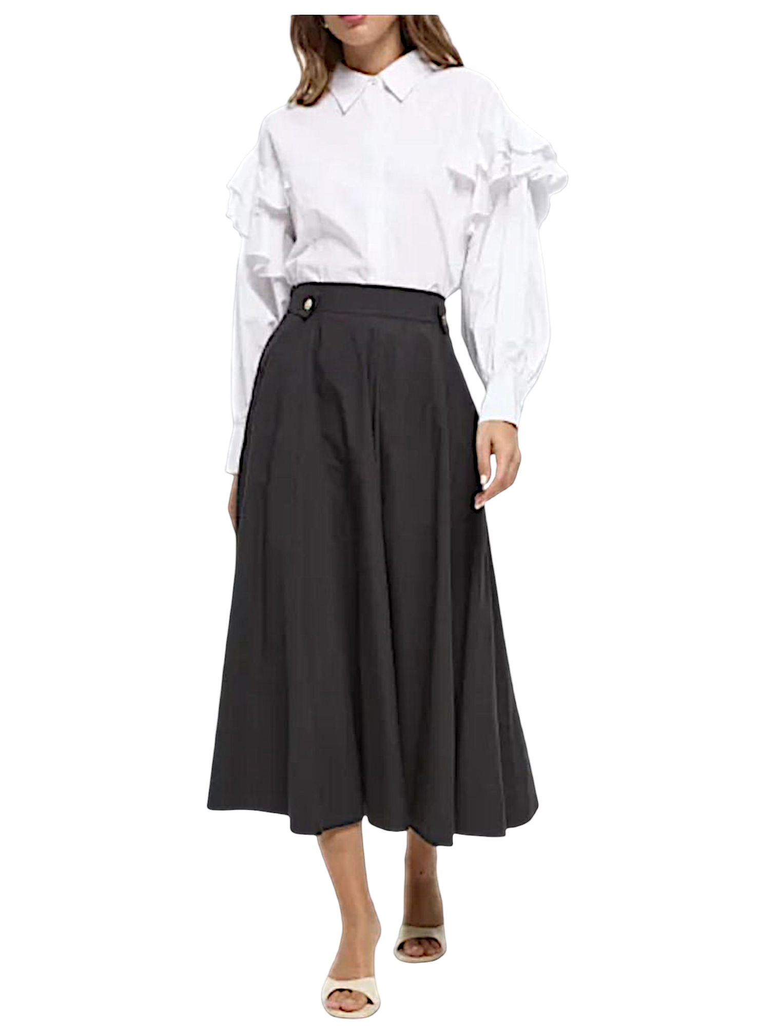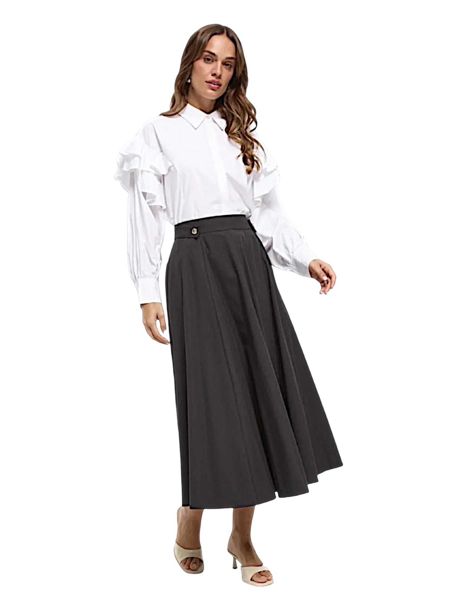 Agrega estilo y comodidad a tu armario con nuestra elegante Falda Larga con Vuelo !!! Cuenta con bolsillos laterales y un detalle de botones dorados en la cintura. Perfecta para cualquier ocasión. Consíguela ahora .