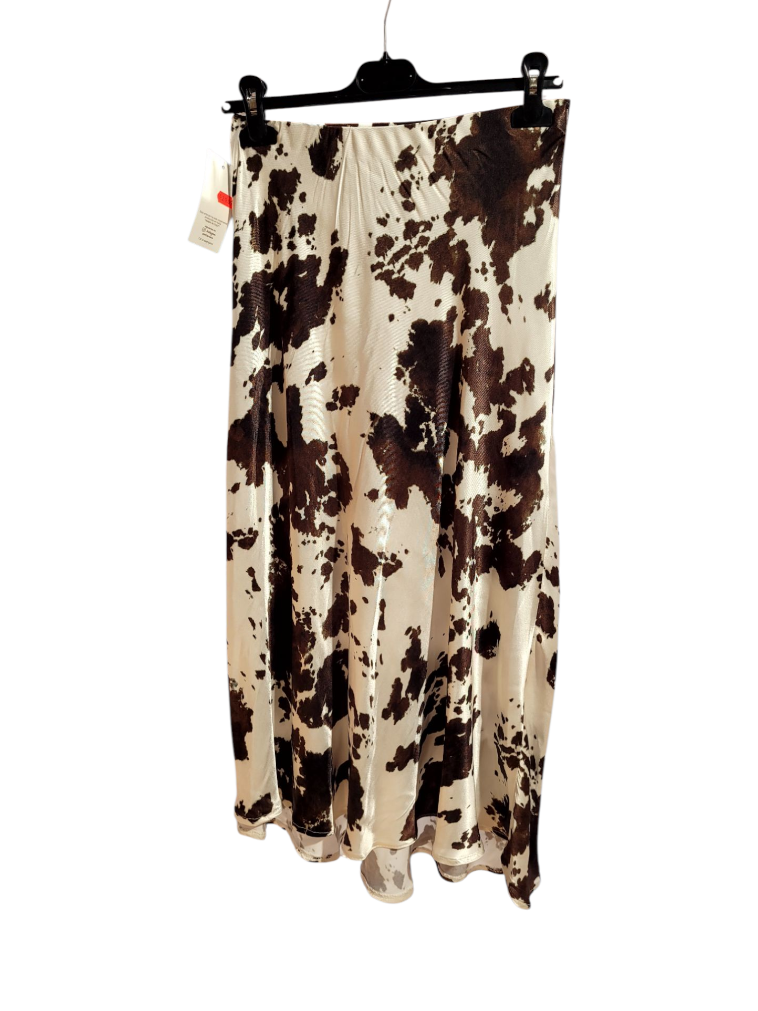 Siente la moda con nuestra falda satinada!! Diseñada con el popular estampado de vaca en tonos marrón y beige, esta falda es perfecta para mujeres de talla 36, 38 y 40.