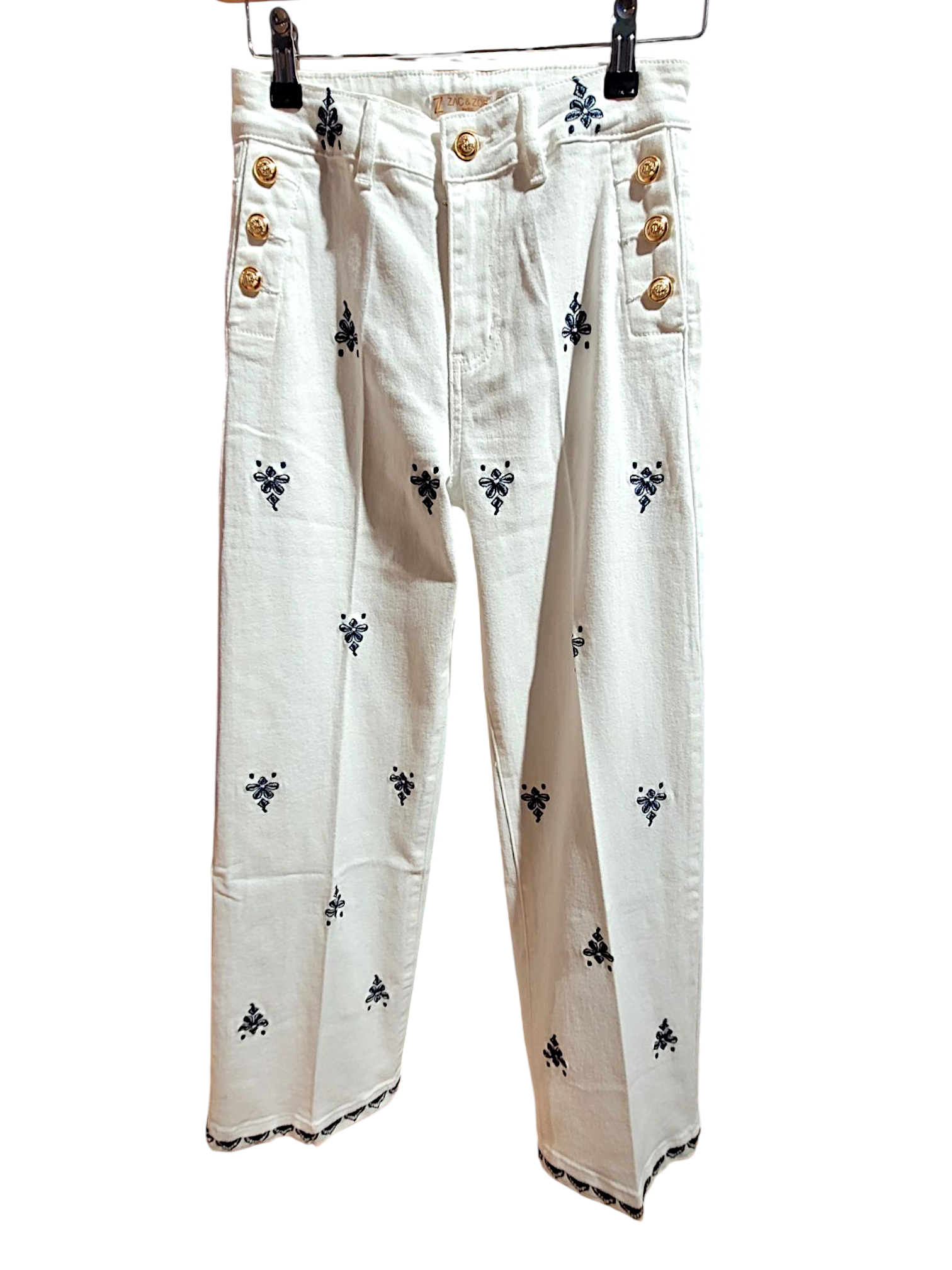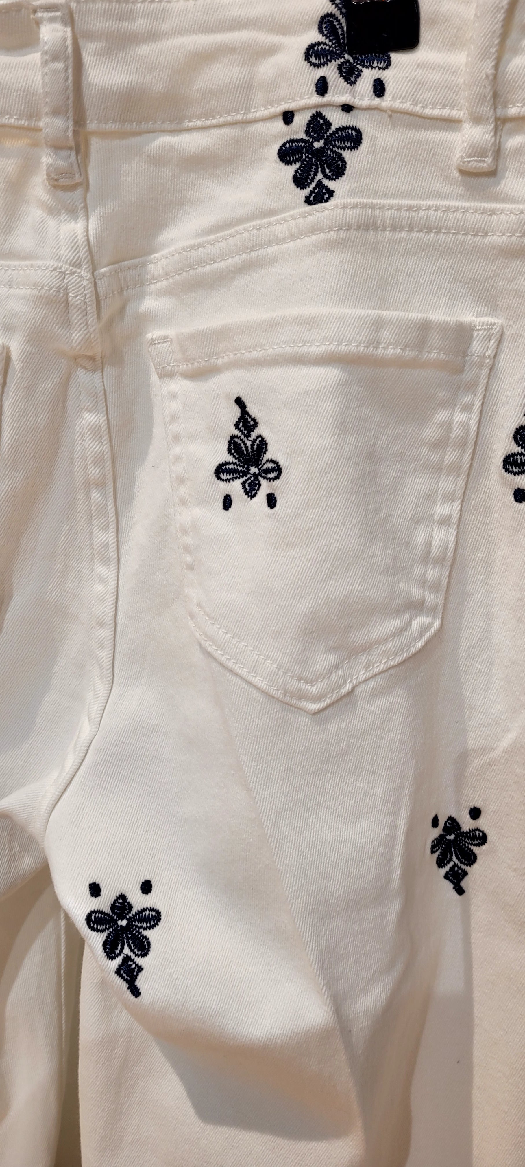 Descubre la elegancia y el estilo exclusivo de nuestro Pantalon Blanco Capri. Con detalles de bordados en azul marino y botones dorados en los bolsillos, este pantalón blanco derrocha sofisticación. Su corte favorecedor y la última tendencia en moda lo hacen la elección perfecta para cualquier ocasión.