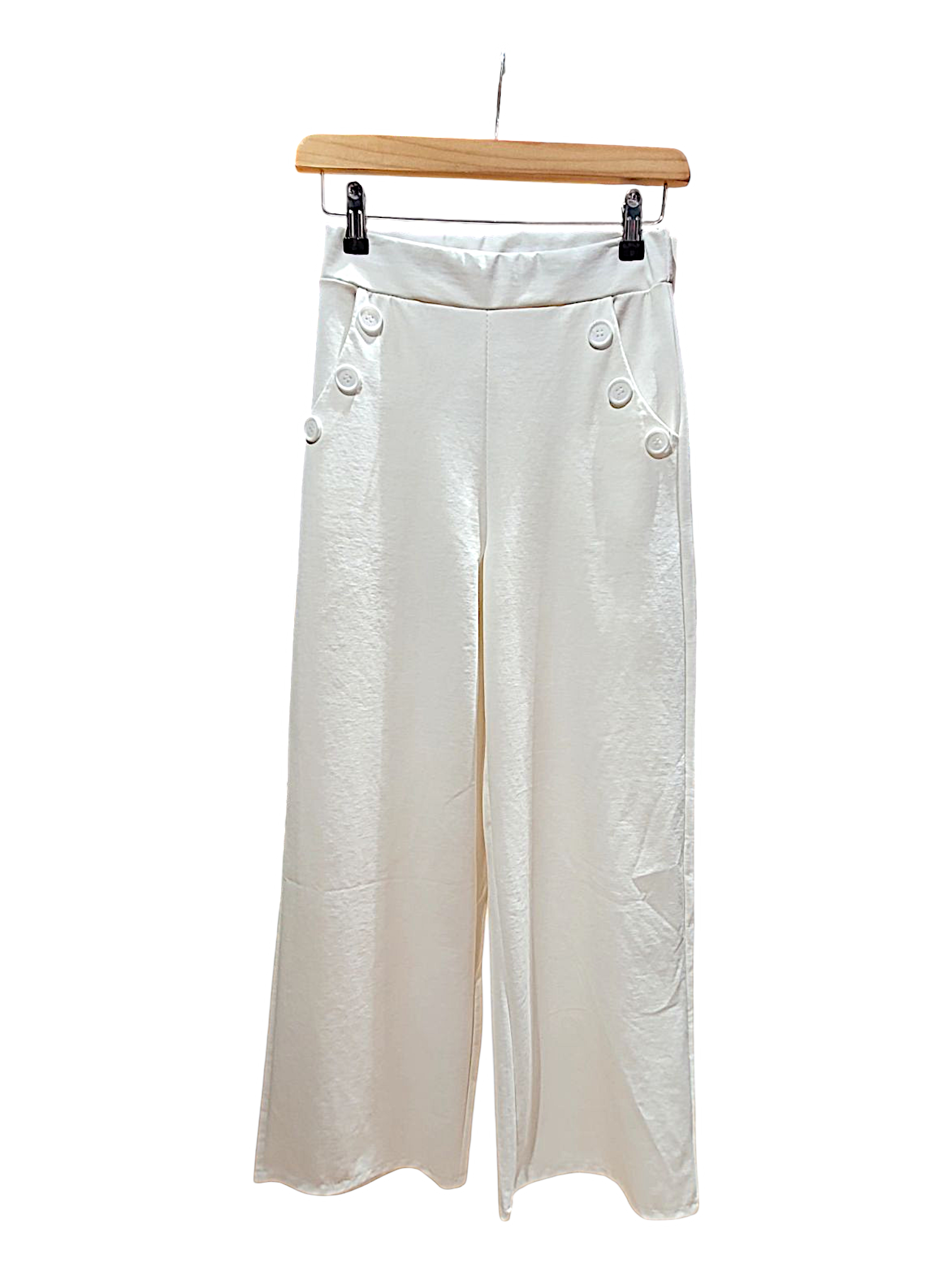 Exclusivo pantalón de corte elegante con detalle de botones en la cintura. Confeccionado en un tejido ligero y de fácil cuidado. Disponible en marfil y negro por solo 19,99 €.