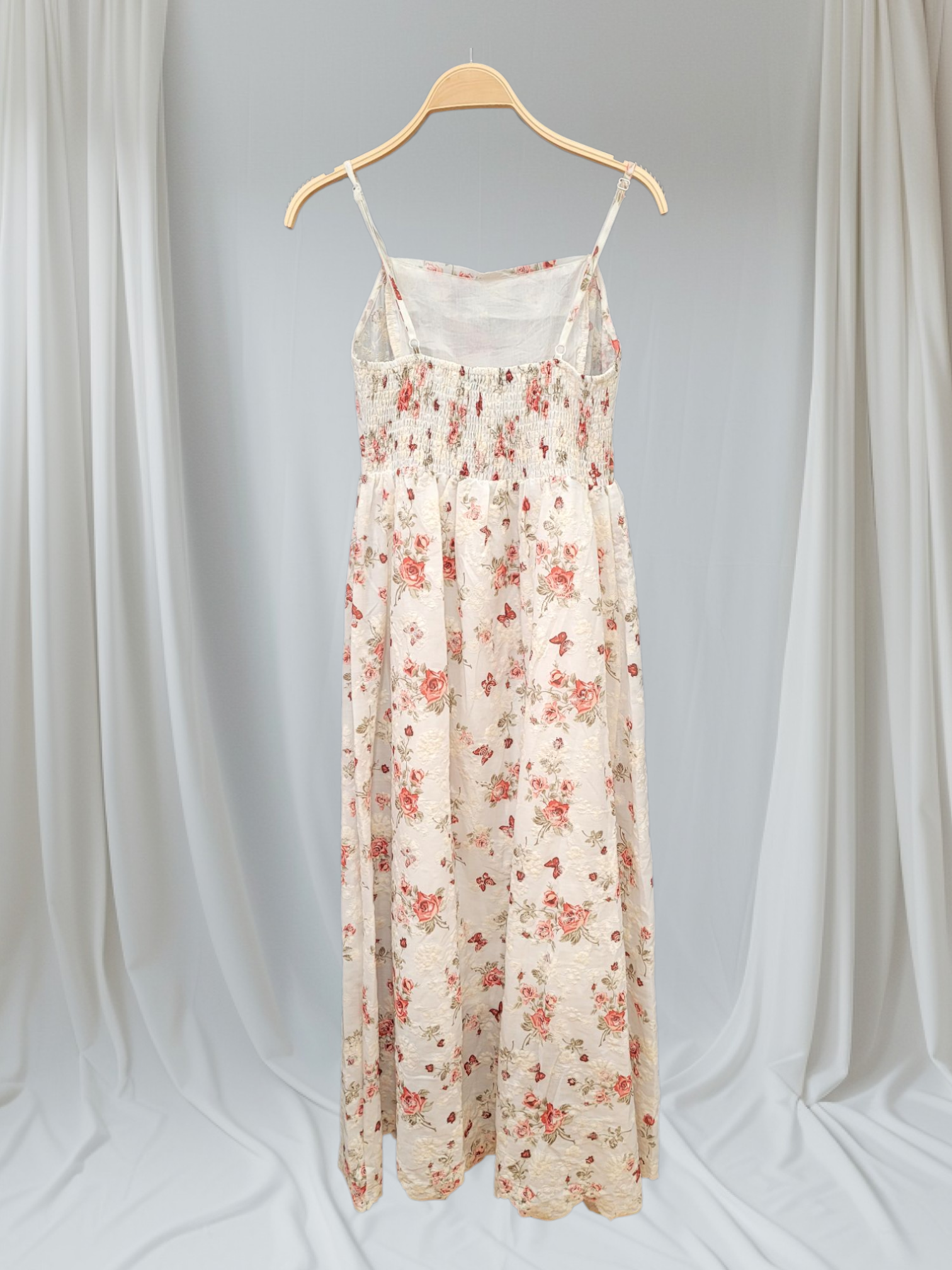 Vestido largo con tirantes finos ajustables y escote recto. Parte delantera lisa y espalda con fruncido tipo nido de abeja para un ajuste cómodo. Confeccionado en tejido ligero con textura bordada y estampado floral en tonos rojos y marfil. La falda fluida y con vuelo lo convierte en una opción ideal para un look romántico y fresco esta temporada.