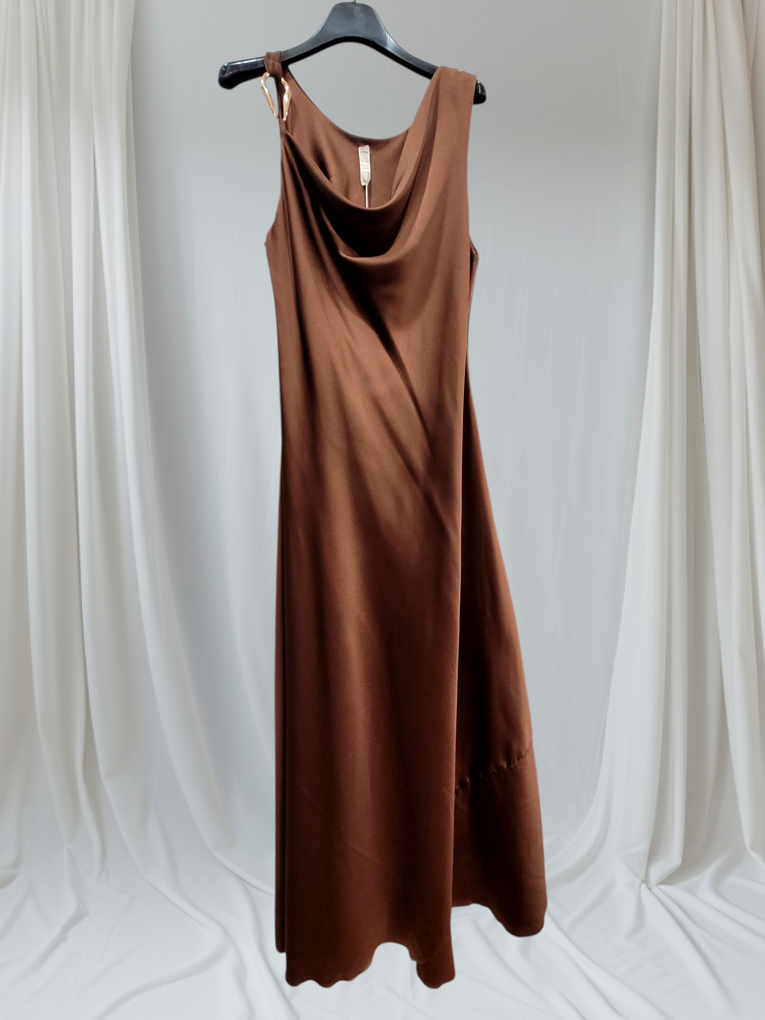 Este precioso vestido de satén presenta un elegante escote asimétrico y un detalle dorado en el tirante. Con talla única, se adapta a tallas 40 y 42. Su precio increíble lo hace una opción accesible y elegante para cualquier ocasión.